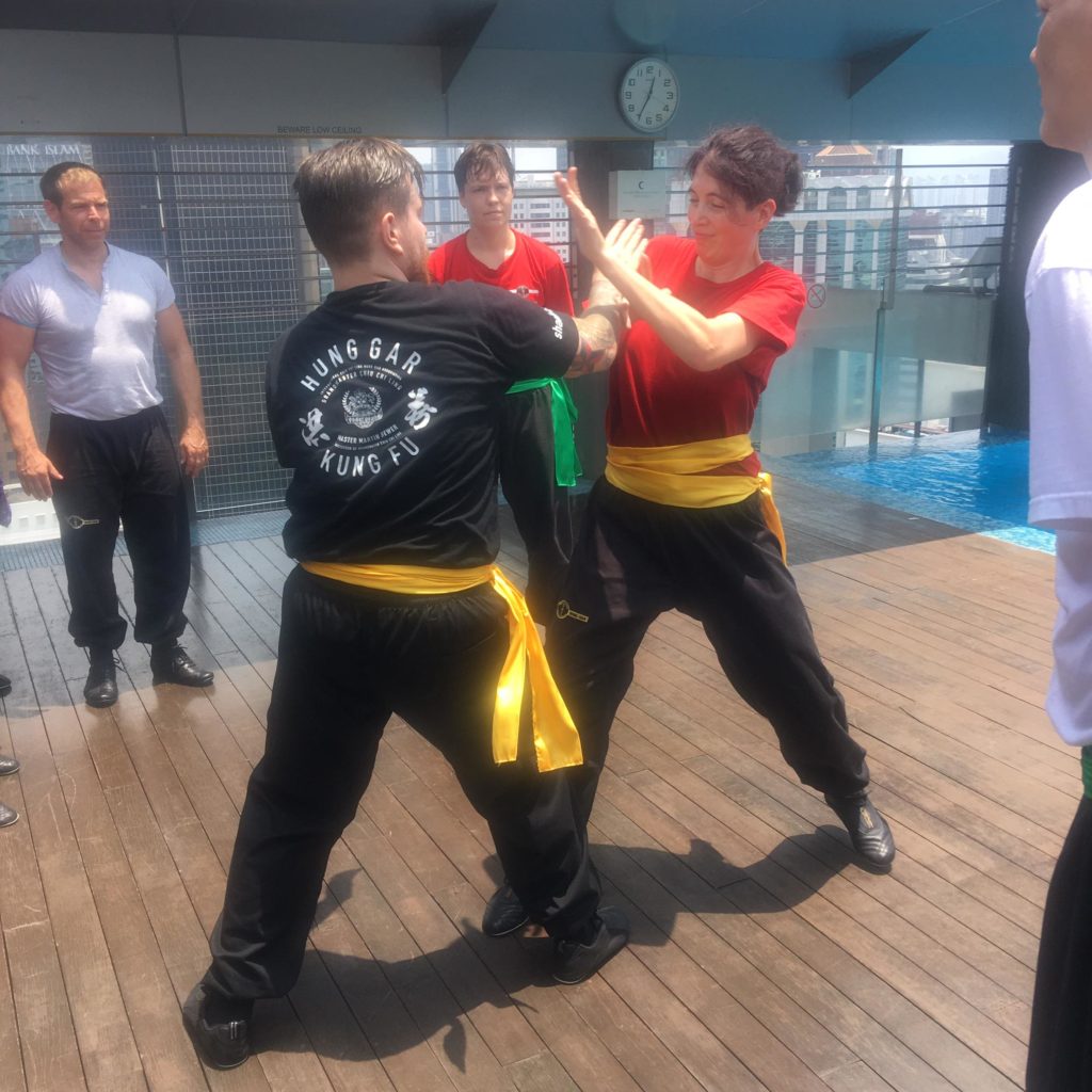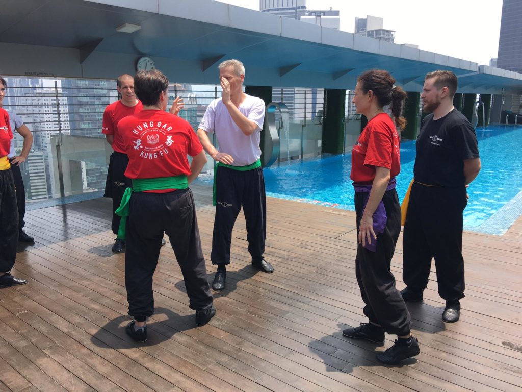 Heute im Unterricht geht’s wieder schwungvoll zur Sache. Schnell und locker, schnell und locker, Tritte, Hände, Füsse, Bewegen, nicht in den Pool fallen. Wer in den Pool fällt muss trainieren, bis er trocken ist, sagt Sifu. Bei den Temperaturen hier wäre das eine Endlosschleife. Training mit Rekursion, sozusagen. Der Fortschritt wird immer deutlicher. Wir haben eine Strategie gelernt, mit der wir arbeiten können. Am Ende des Unterrichtes machen wir wie die Woche zuvor eine 1 vs 1 Kampfsituation und es wird schneller, dynamischer und besser. Was vorige Woche einfach noch funktioniert hat, trifft jetzt auf Kontertechniken, die wiederum auf Konter treffen. Es wird schneller. Spannender.