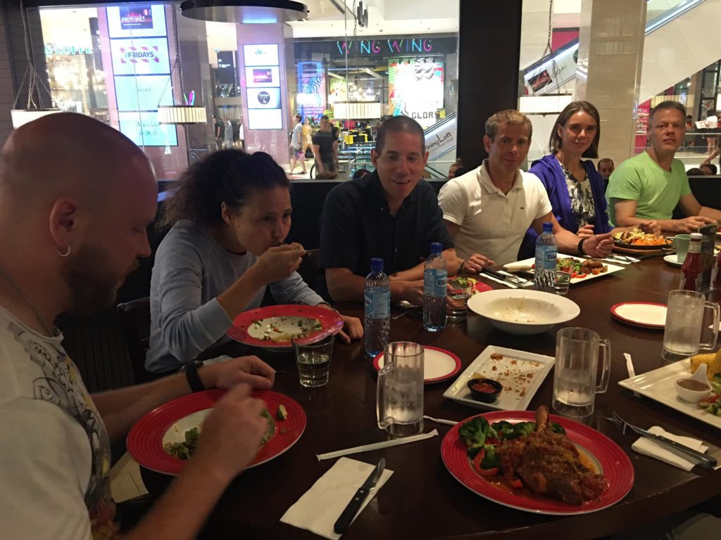 Ein Taxi bringt uns zum nächsten gemeinsamen Treffpunkt. Zurück zur Timesquare-Mall. Zur Feier von Claudios Geburtstag gehen wir gemeinsam Lasertag spielen. Drei Games in jeweils zwei Teams. Die erste Runde ist so ausgeglichen, dass wir die Gruppen (Roman, Nadine, Wojtek, Sanel vs. Sifu, Claudio, Alex, Ich) gar nicht mehr umstellen. In der zweiten Runde ist dann Friendly Fire möglich .Wann immer versehentlich ein Teammitglied abgeschossen wird, erklingt ein dissonanter Ton. Faszinierenderweise passiert das einmal dreimal hintereinander, als unser Team gerade zusammensteht… Die dritte Runde findet ohne Licht statt. Wir laufen, schiessen, schwitzen und lachen und es ist ein gelungener Event.