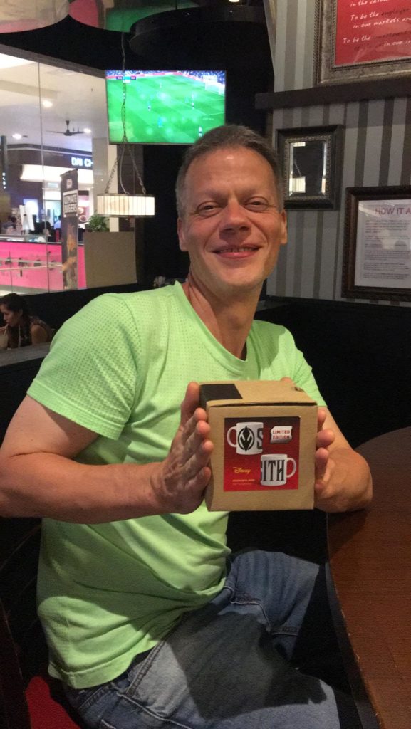Das Restaurant mit dem All-You-Can-Eat-Grill ist leider völlig überfüllt und hat eine lange Warteschlange, so dass wir zum Friday ausweichen und dort gemütlich gemeinsam essen und natürlich Claudio seine Geburtstags-Sith-Tasse überreichen. Anschliessend findet sich noch eine kleine Gruppe zur Fussmassage und gemütlichen Ausklingen lassen des Tages.