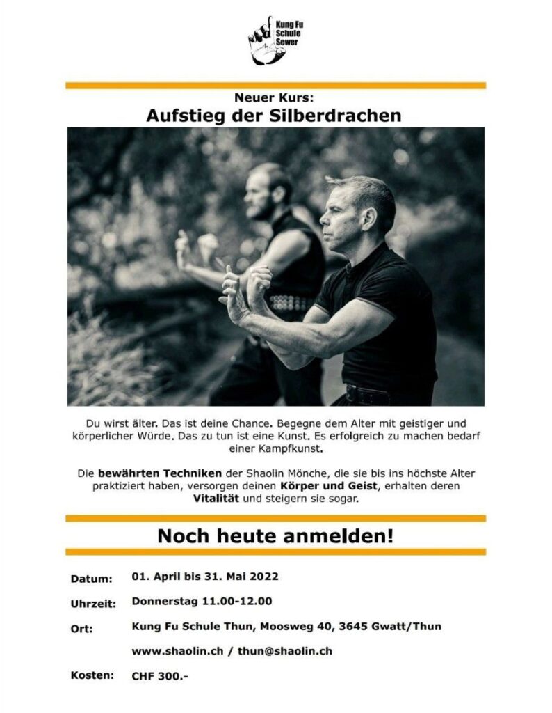 Erst gestern habe ich noch unsere älteren Schüler erwähnt und das wir für diese «Silberdrachen» eigene Kurse anbieten. Hier ein konkretes Beispiel für den Kurs «Aufstieg der Silberdrachen». Berührungsängste sind unangebracht, wenn man bedenkt, dass die Shaolin Mönche Hung Gar Kung Fu bis ins höchste Alter betreiben. Nicht nur für den Körper, sondern auch für den Geist.