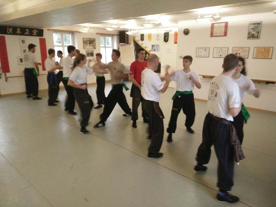 Dabei war besonders das korrekte Üben miteinander eine neue Herausforderung für die Teilnehmer. Denn nur bei einem Angriff/Schlag mit echter Absicht kann man wissen ob die eigene Technik im Ernstfall wirklich funktioniert hätte. Natürlich durften neben den zahlreichen Stunden Trainieren aber auch gemeinsame Mahlzeiten und Gespräche über unser Kung Fu nicht fehlen. Sogar für einen Film war nach dem Essen am Abend noch Platz und man schaute zusammen «Shaolin challanges Ninjas» mit Gordon Liu in der Hauptrolle.